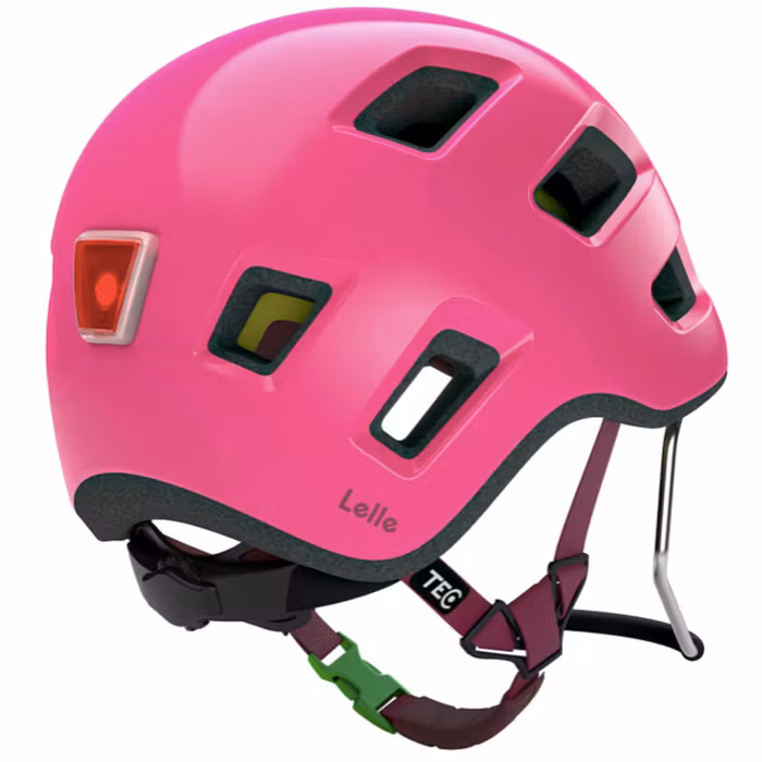 Lelle är en helt ny typ av barnhjälm utvecklad för barn, på riktigt. En säker inmould kvalitetshjäm med en unik och djupare passform, som täcker hela huvudet. Lätt att ta på och sitter alltid säkert med justerbart twist nacksystem där ringen spänner runt hela huvudet. Nyutvecklat justerspänne för remmar bidrar till att hjälmen sitter optimalt och att inga band trasslar sig. Extra tjock EPS-skum som gör att smällen tas upp "mjukare" samt MIPS rotationsskydd ger maximalt skydd för hjärnan. Lelle har integrerad belysning bak för bättre synlighet i trafiken. Hjälmen är utrustad med grönt spänne för kombinerad lek och cykling. Storlekar för de minsta från 44 cm. Kommer med störtbåge och en hjälmmössa som ersätter kuddarna när det är kallt och gör att hjälmen sitter perfekt oavsett säsong.